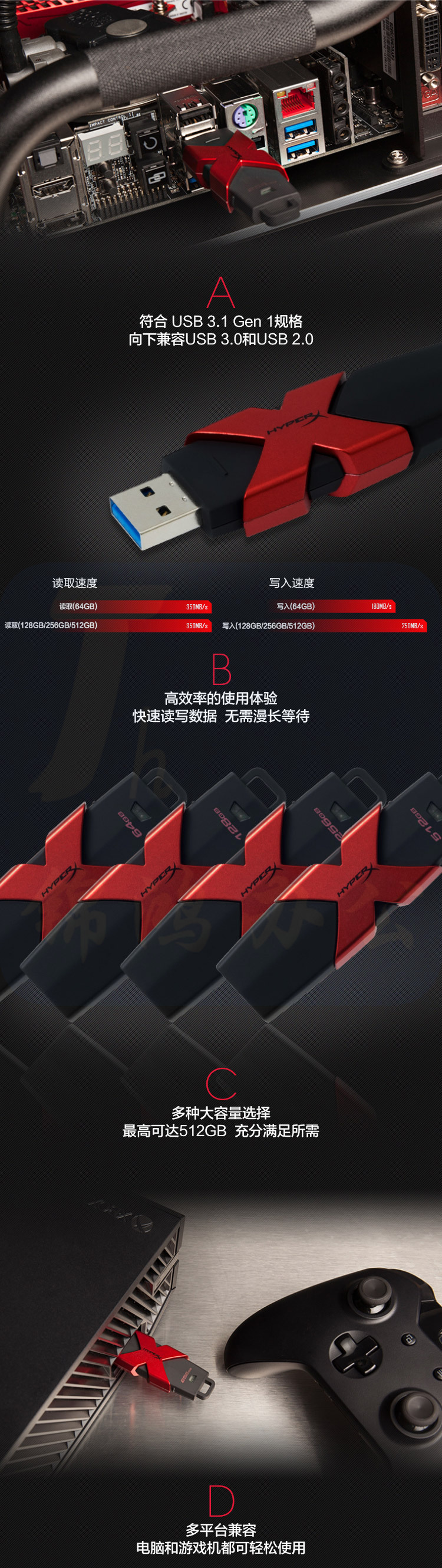金士顿 128GB USB3.1 U盘 HXS3 读速350MB/s 高速酷炫 多平台兼容