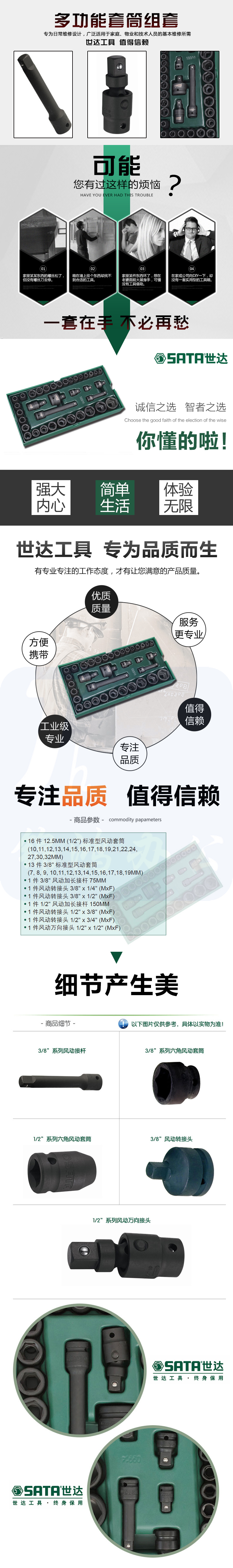 世达(SATA)工具托组套-36件3/8"x1/2"系列风动套筒 09914