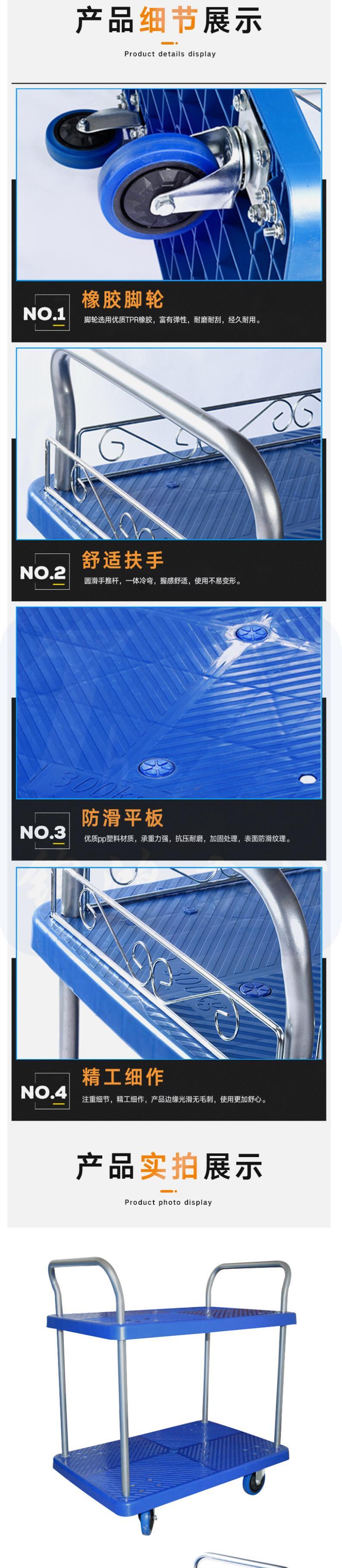 双层平板手推车 双扶手两层搬运车 拉货车 60*90cm 无护栏 承重300kg 货号:JC