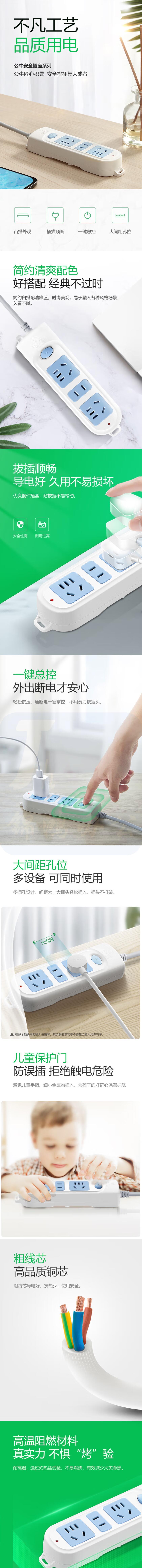 公牛GN-606 4米接线板插排/插拖线板带开关3孔位插电板
