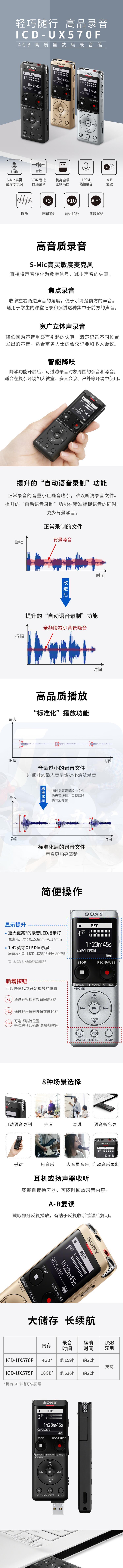 索尼(SONY) ICD-UX570F 数码录音笔 降噪 自动录音 AB复读 银色