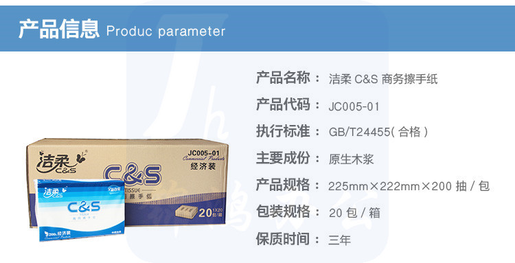 洁柔(C&S) 经济装商用擦手纸 JC005-01 单层 200抽 20包/箱