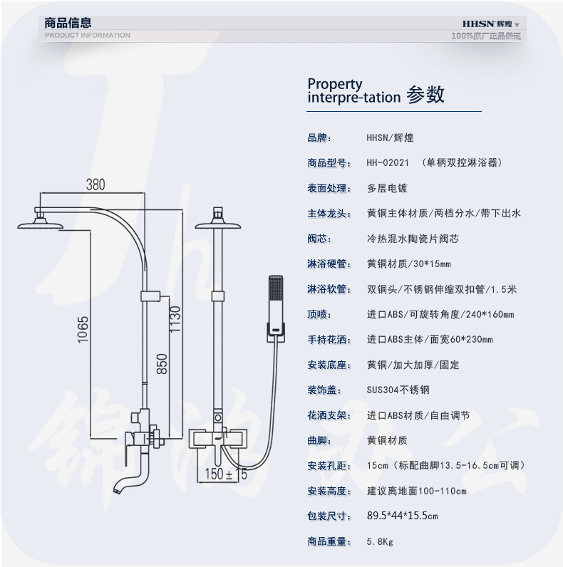 HHSN 辉煌花洒卫浴带下出水龙头淋浴器大淋浴花洒套装彩色花洒方管 HH02021