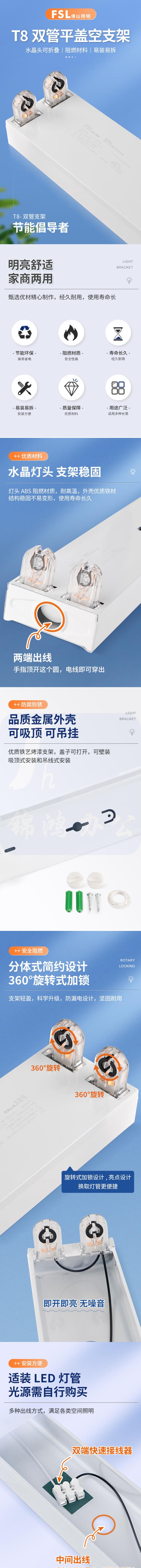 佛山照明T8 双灯管平盖支架1.2米双端供电中间出线 LED灯管专用(不含安装)