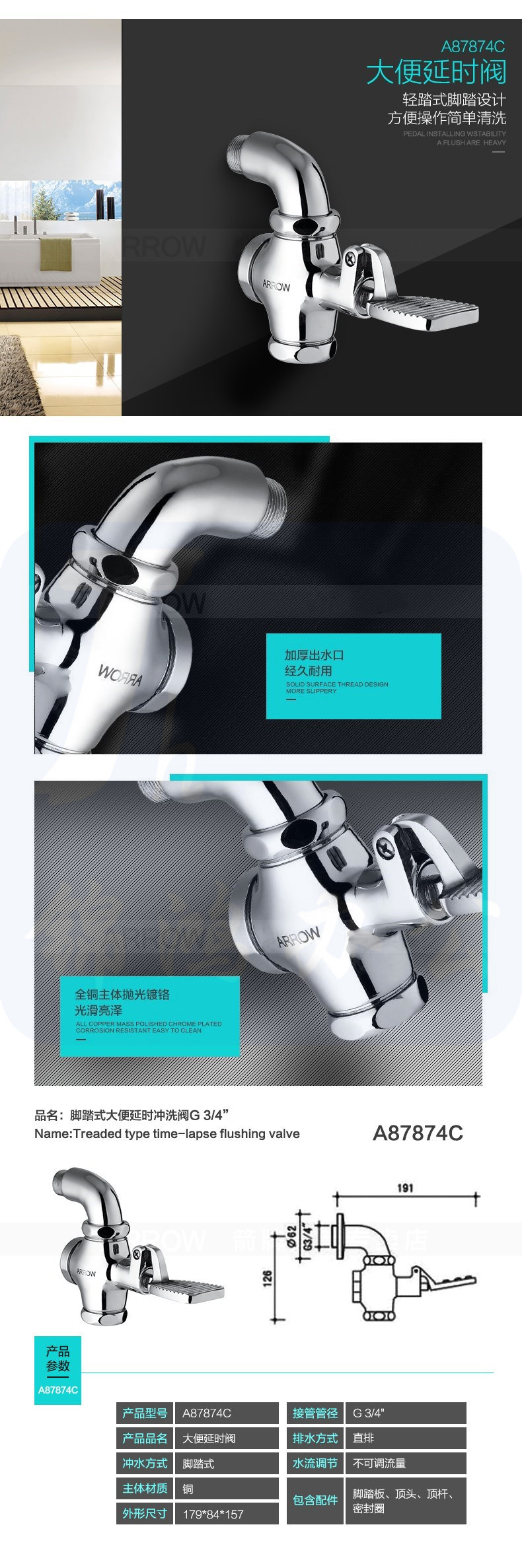 箭牌(ARROW)大小便延时冲洗阀 脚踏式A87874C,