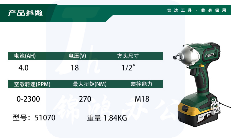 世达(SATA)1/2"系列18V锂电冲击扳手51070