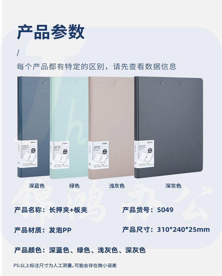 得力5049 押夹+A4板夹文件夹310*240*25mm 蓝灰