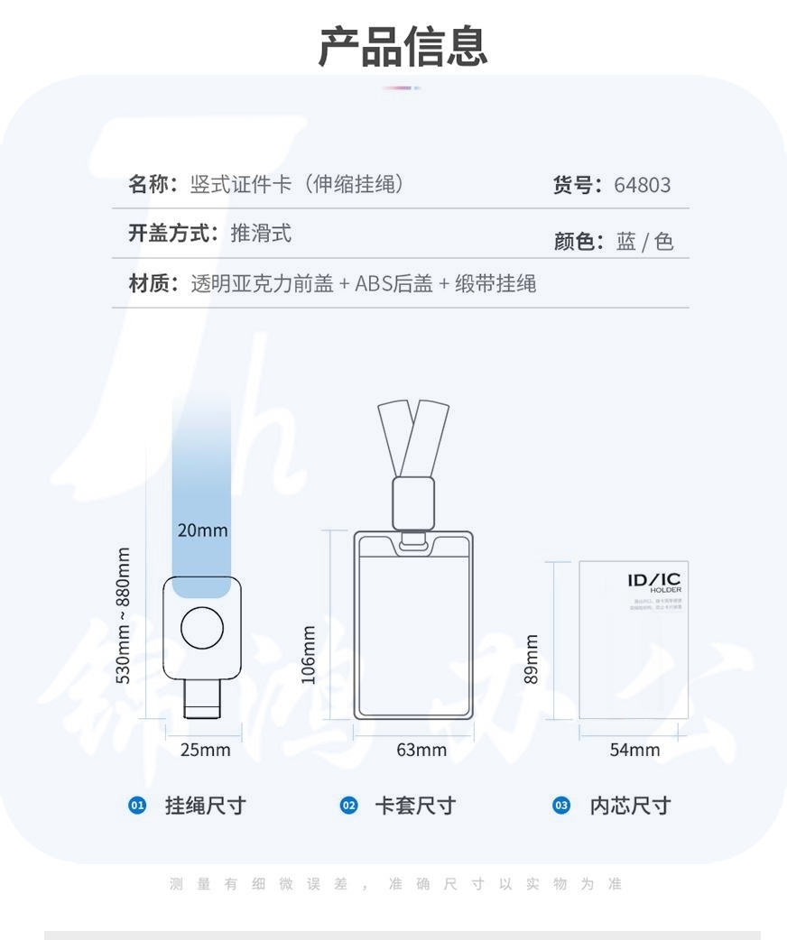 得力 64803 胸卡竖式证件卡套 蓝色高透亚克力可伸缩挂绳(48个/盒)