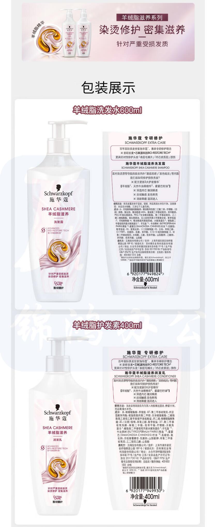 羊绒脂滋养洗护套装 施华蔻 600ml洗发水+400ml润发乳 白色