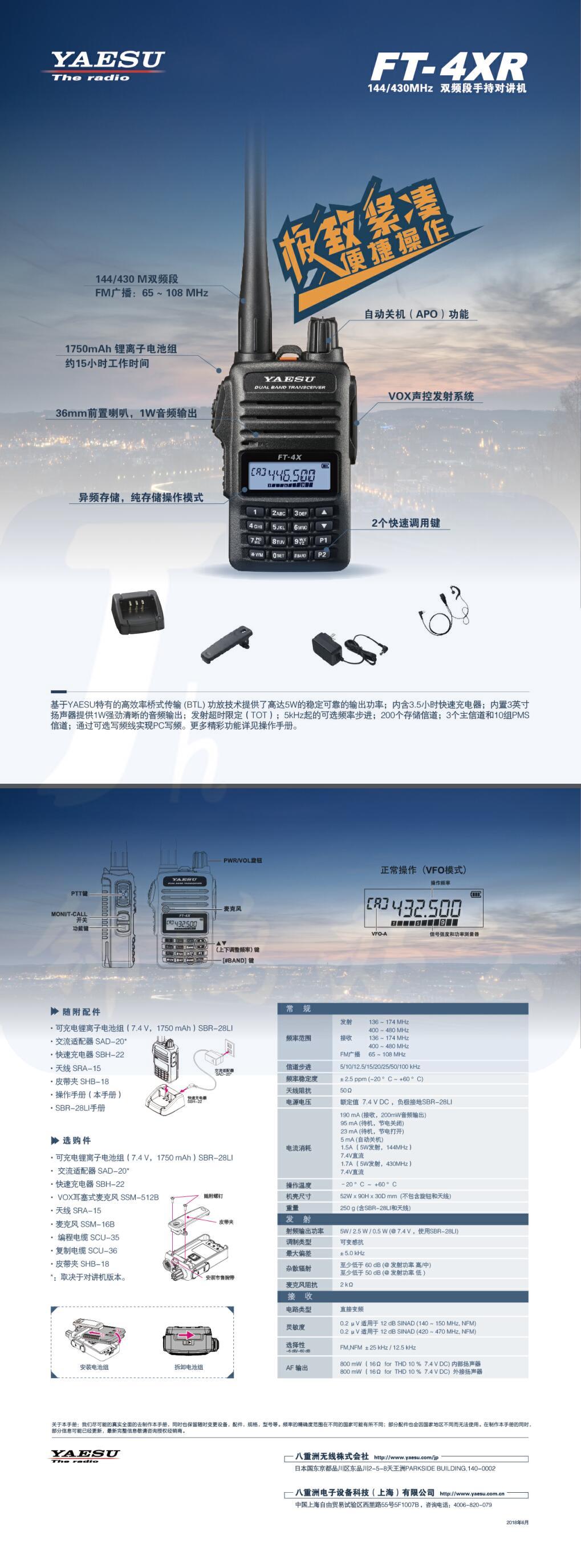 YAESU 八重洲 FT-4XR 手持台 自驾游大功率电台 双频段多功能手台