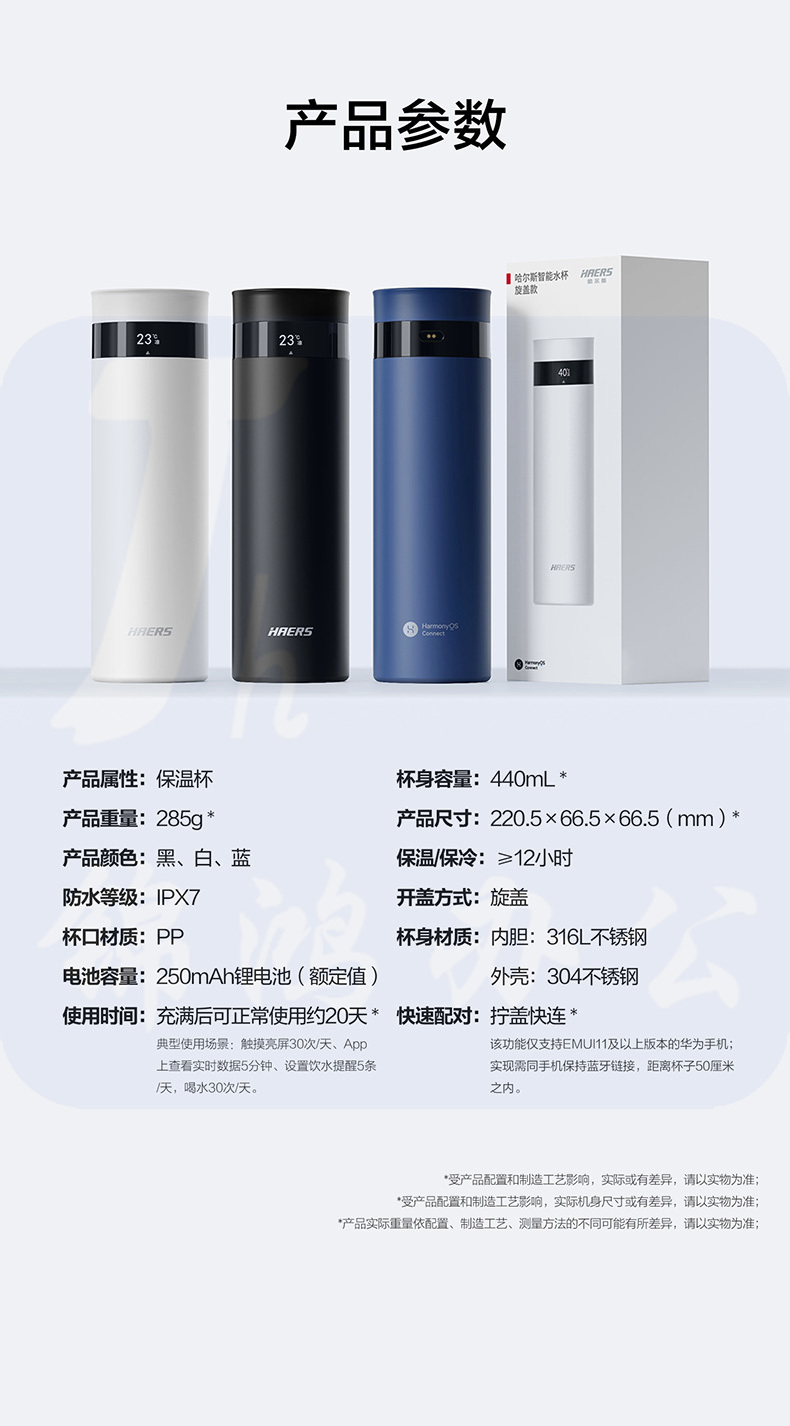 华为智选 哈尔斯智能保温杯440ML 男女士水杯家用茶杯杯子旋盖款水杯