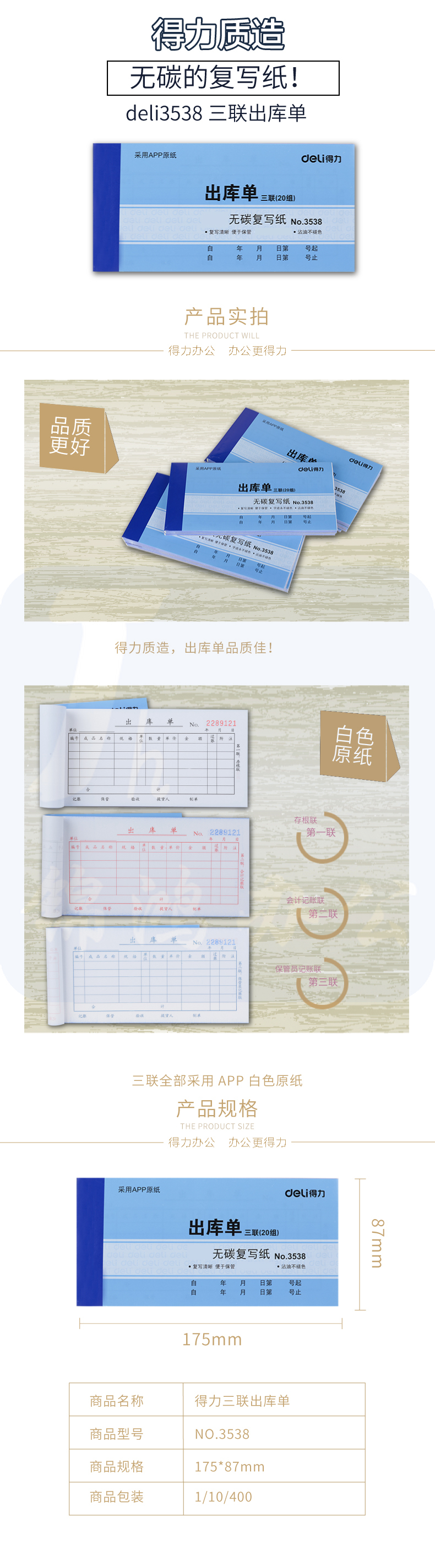 得力3538无碳复写单据领三联料单出库单(蓝)87*175mm(10本)