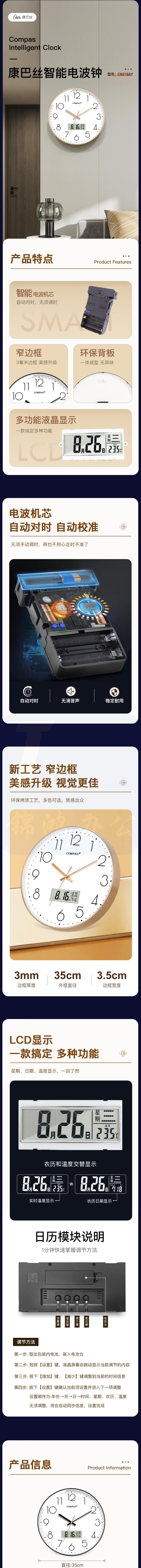 康巴丝 35cm 挂钟13.8寸 时钟万年历钟表自动对时电波钟 C6219AY钢琴黑
