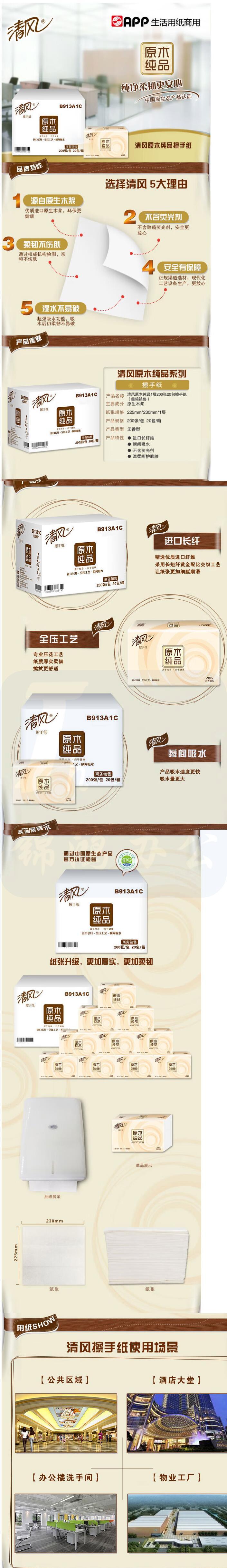 清风擦手纸200抽20包原木纯品225*230mm B913A1C