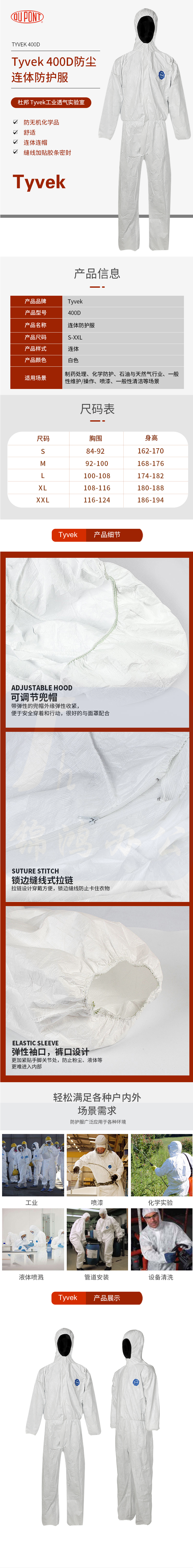 杜邦 连体防护服双面料400D透气实验室防尘带头罩不带脚套XXL