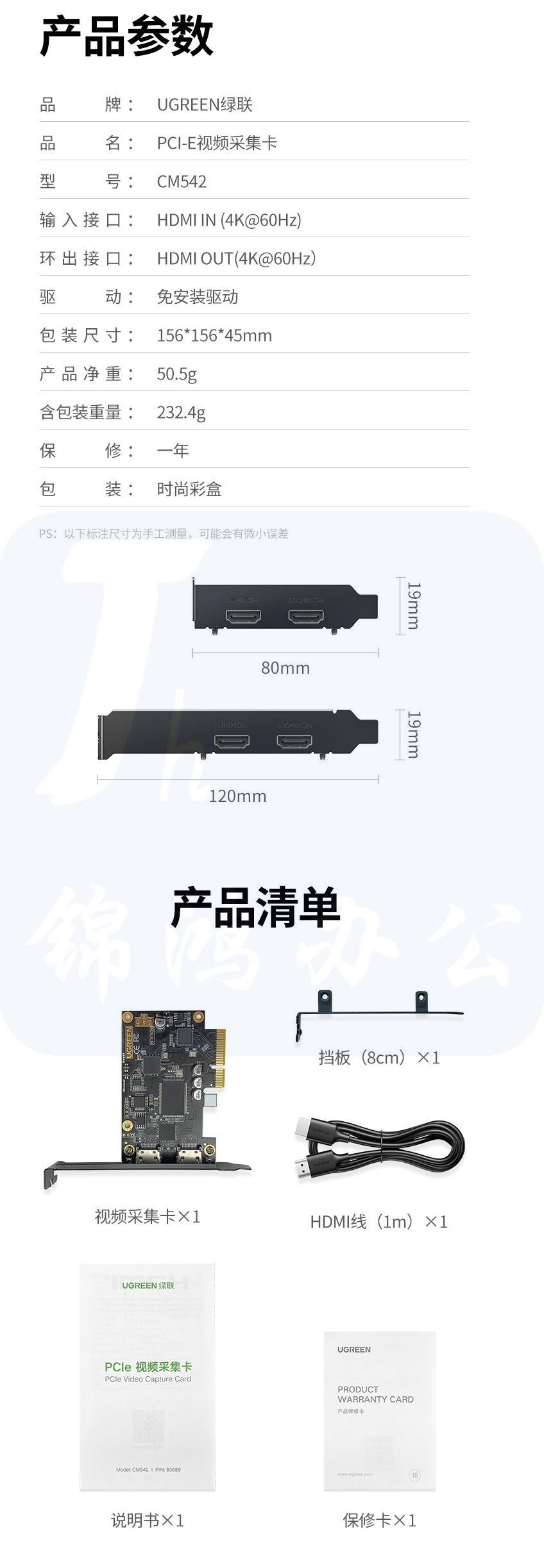 绿联 HDMI视频采集卡内置PCIE高清采集器 适用电脑监控相机摄像机直播采集录制 PCI-E视频采集卡