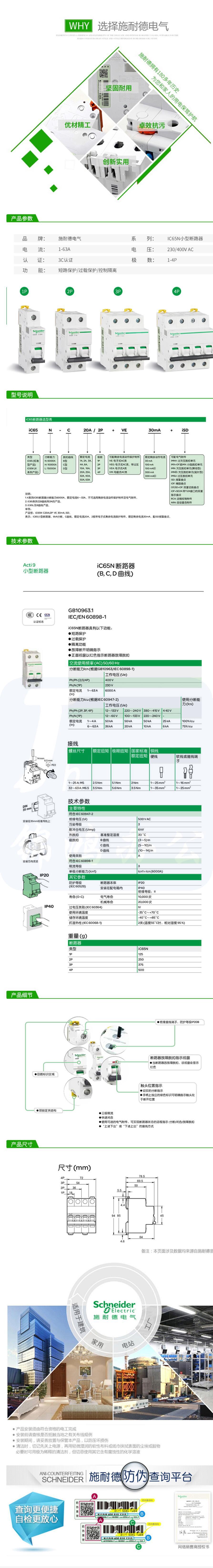 施耐德 D型断路器 iC65N 2P D32A 空气开关