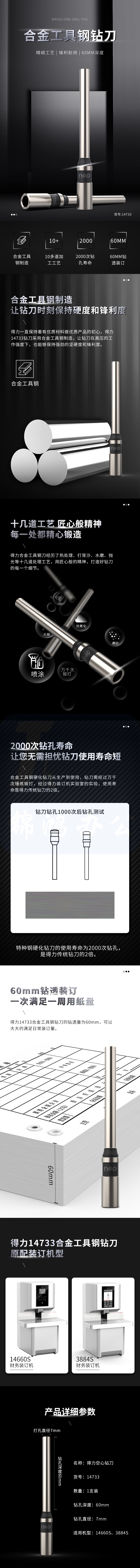 得力14733 钻刀空心钻刀财务凭证装订机专用冲头刀头1个 φ7.0*60mm钻刀