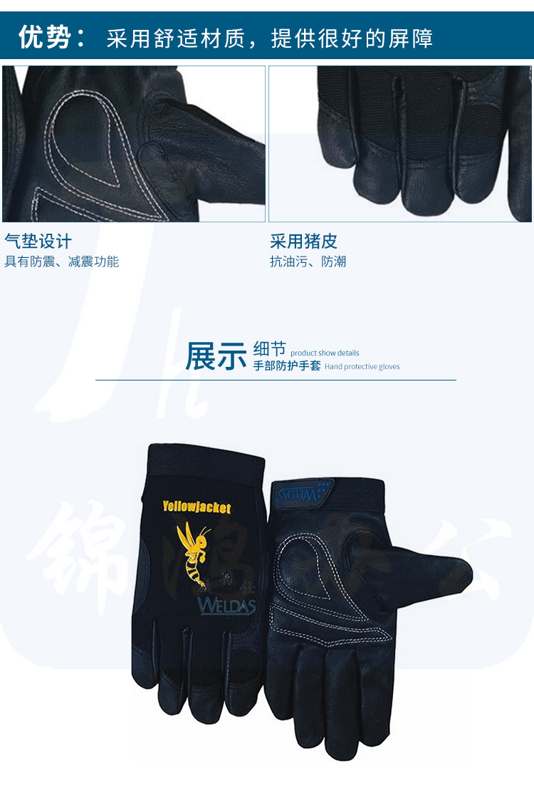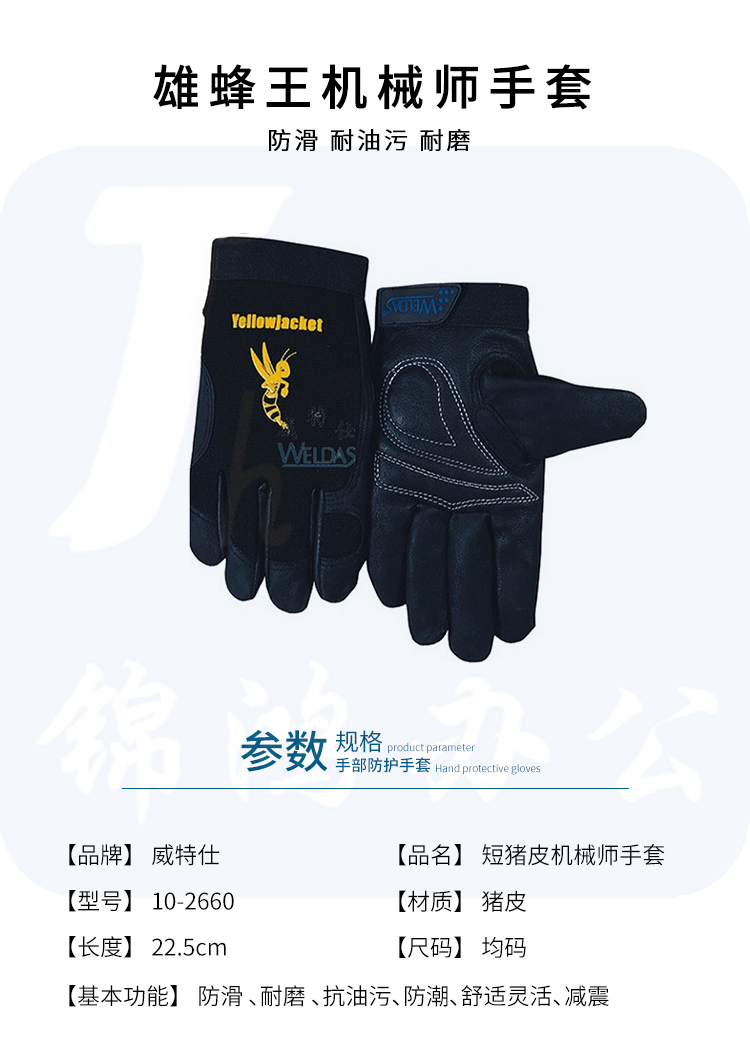 威特仕 10-2660 雄蜂王猪皮机械师手套抗油污防潮赛车手手套舒适灵活黑色 1副
