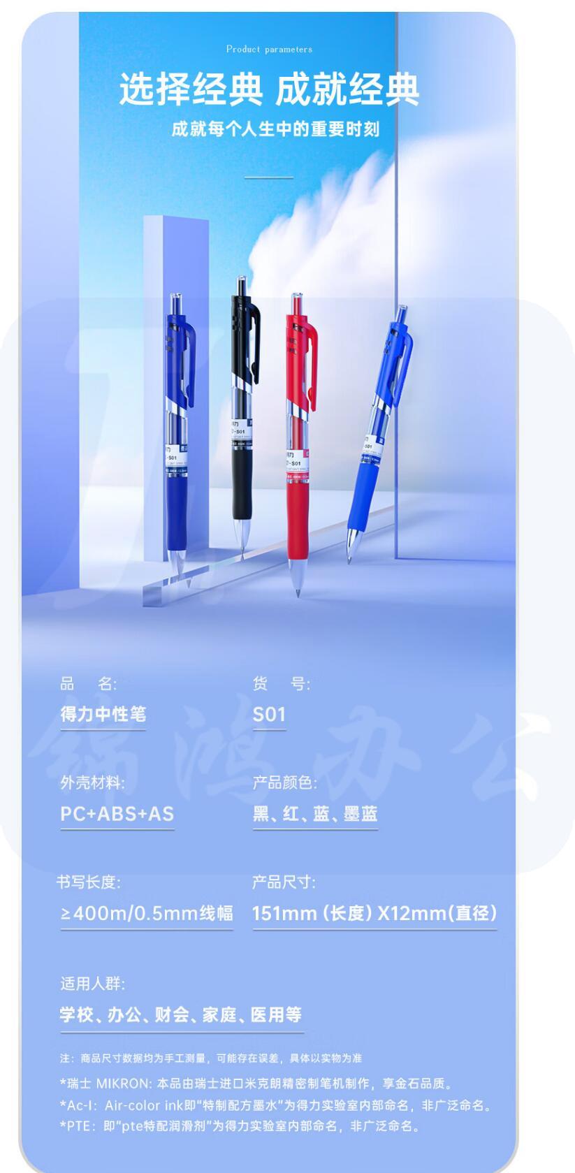 得力 S01 红色 中性笔 0.5mm子弹头经典办公按动笔水笔