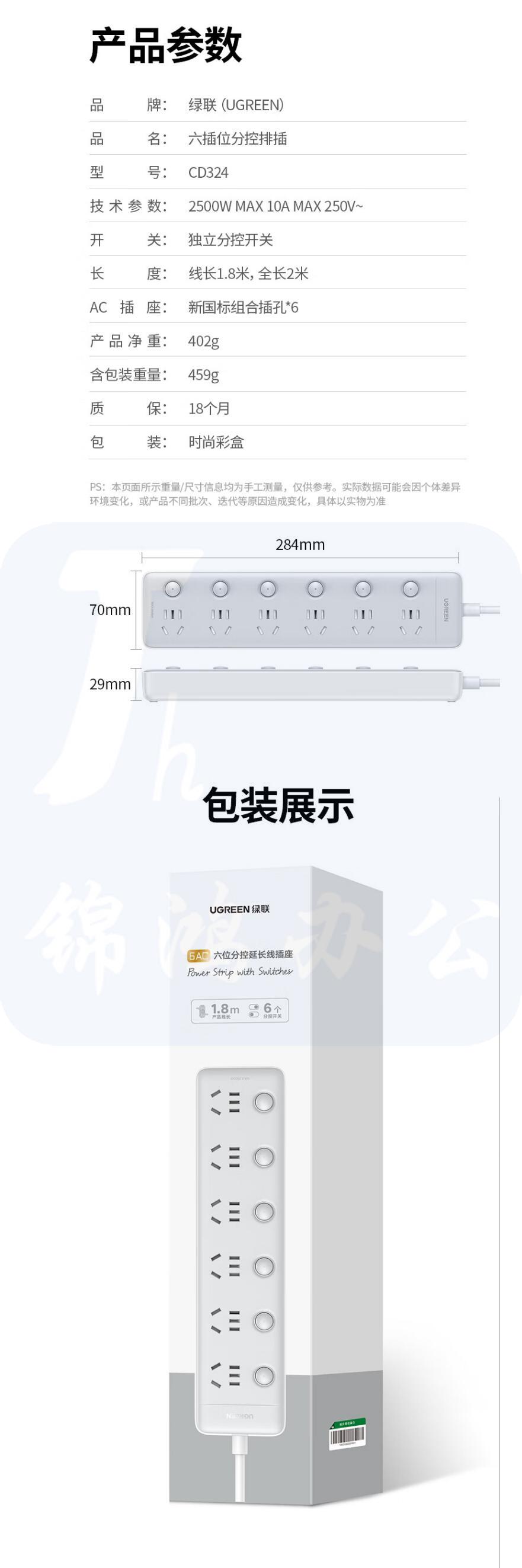 绿联 新国标插排/插线板/插座带线 6位分控五孔 1.8米 15081