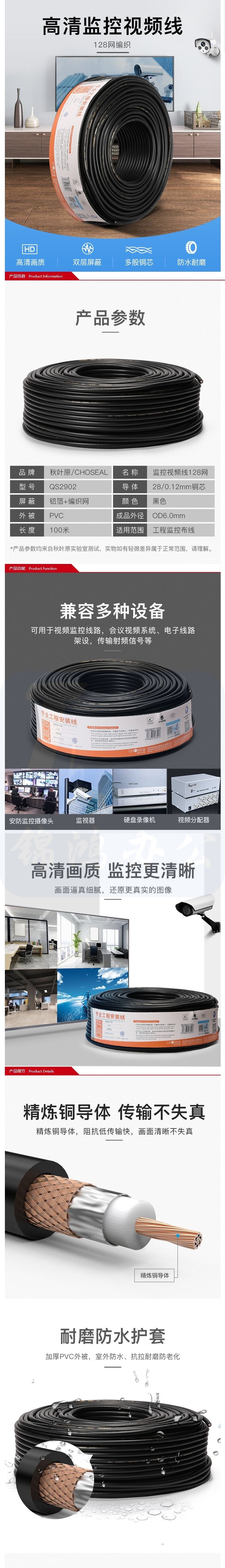 秋叶原(CHOSEAL)QS2902T100S多股铜芯128网纯铜编织监控视频线 100米 货号:HXE