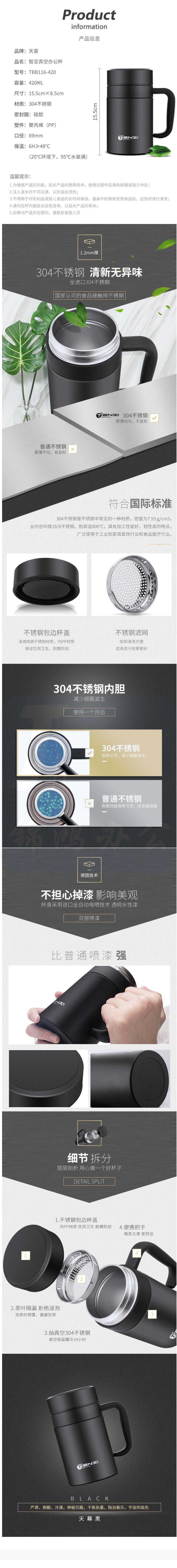 天喜 黑色520ml 保温杯 泡茶杯304不锈钢水杯带把手杯