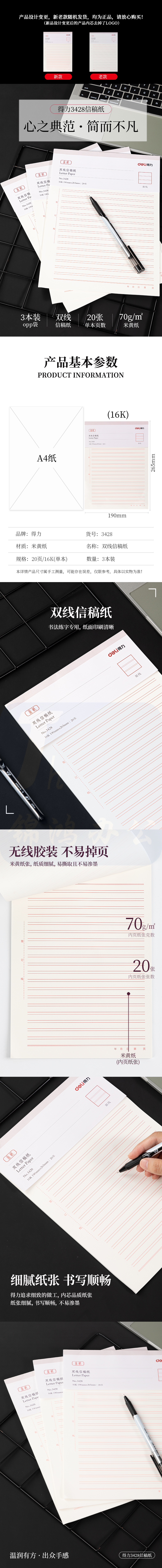 得力 信纸 16K/20张3本装 双线信纸信稿纸 70g-266*190mm 3428