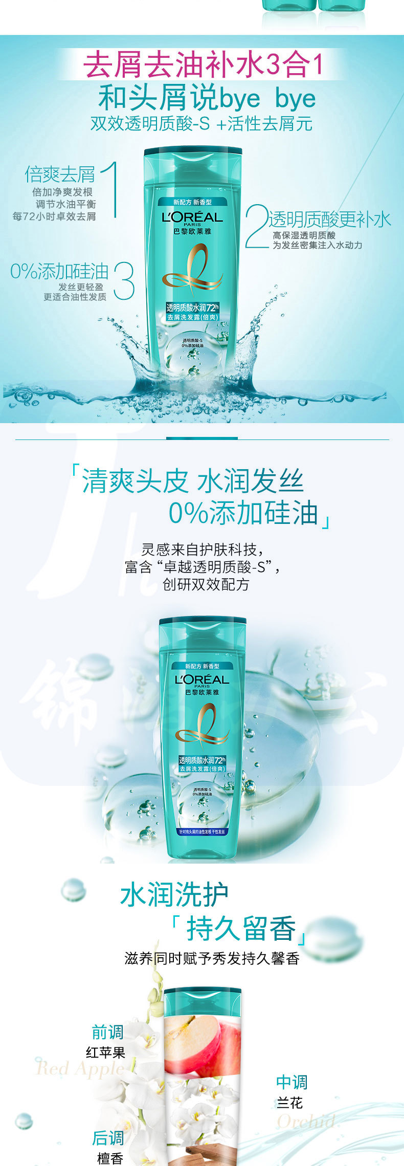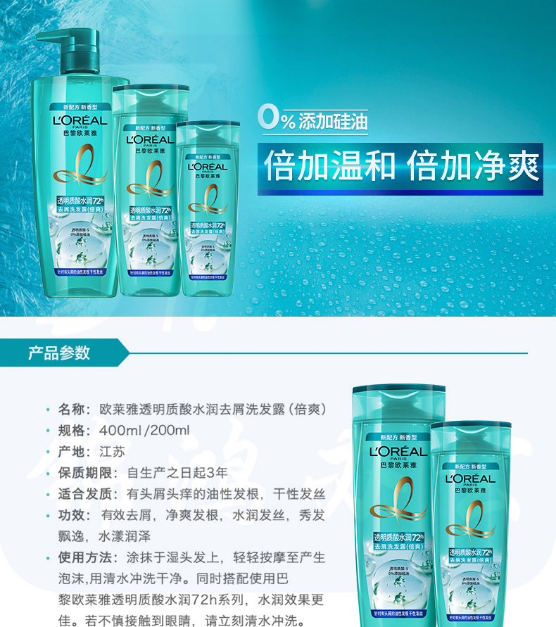 欧莱雅 透明质酸水润去屑洗发露 400ml (倍爽)