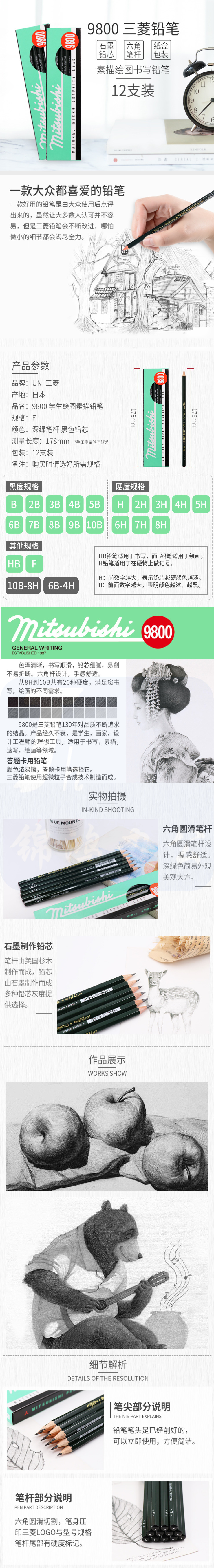 9800 三菱铅笔 绘图铅笔 绘画素描铅笔 多灰度 F (12支装)